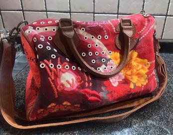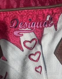 Borsa della Desigual della collezione "True Love", caratterizzata da stampe floreali e scritte ispirate all'amore in tessuto con rifiniture in ecopelle Misura L 29 H 25 P 16 Mai usata