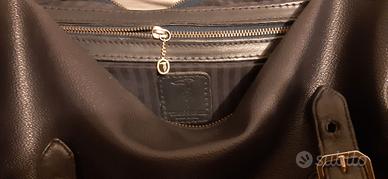 Borsa bauletto Trussardi in ecopelle, mentre manico+intarsi, profili, simbolo e 3 fibbie di chiusura sono in vera pelle, 5 piedini metallici dorati d'appoggio, una tasca esterna con chiusura a pressione e due tasche interne, di cui una è chiusa con zip, in buone condizioni. Misure 25+7 (manico)/33/14 cm