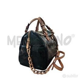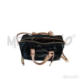 BORSA BAULETTO MICHAEL KORS IN VERNICE VERDE CON LOGO IN RILIEVO APERTURA CERNIERA DUE MANICI E TRACOLLA ACCESSORI METALLO DORATO IN BUONE CONDIZIONI MISURE 26X24X20