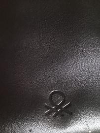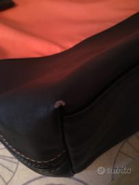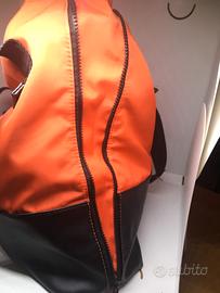 Borsa Benetton grande nera e arancio neon; nylon e vera pelle; maniglie, tasca interna e fodera.