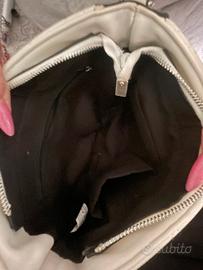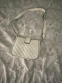 Borsa a tracolla bianca trapuntata con dettagli argento, stile minimal ed elegante. Misura piccola/media, perfetta per outfit casual o serali. Chiusura frontale con fibbia metallica, tracolla regolabile. Usata ma in buone condizioni, con normali segni d’uso. Capiente per essentials.
