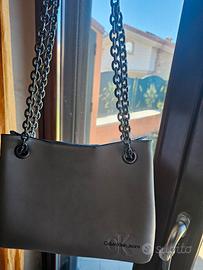 Borsa di colore bianco in vera pelle. Nuova, senza cartellino. Marchio Calvin Klein. Borsa esternamente di pelle liscia con due manici a catena in acciaio. Logo sul davanti e sul dietro e anche all'interno. Internamente dotata di tre scomparti di cui un taschino con logo. Chiusura a calamita molto ermetica. Misure Lunghezza cm 26 Altezza cm 19 Profondità cm 10 Manico 1 cm 80 Manico 2 cm 80