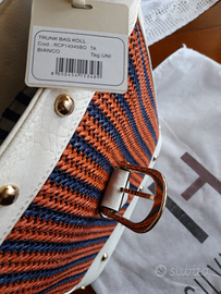Borsa a secchiello con tracolla in palma di rafia ed ecopelle; cBorsahiusura con fibbia, applicazione di borchie e logo lettering in metallo. scomparti interni. Dimensioni: 34 cm x 31 cm. 100% poliuretano
