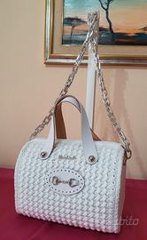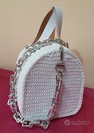 Borsa bianca stile bauletto fatta a mano, all'uncinetto. Il corpo borsa è in candido cordino in polipropilene, lavabile con panno umido e sapone di Marsiglia, ripassato con panno umido, ritorna perfettamente bianco. Le parti in vera pelle, manici e decorazione,sono di fattura artigianale prodotte e ideate in Italia da Federica Evaristo. La fodera è misto seta a motivi multicolori. La tracolla è leggera in materiale acrilico lunga 100 cm.