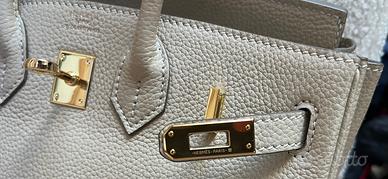 Borsa modello Birkin, color Craie (bianco/beige chiaro), misura 25, in vera pelle tipologia Togo, è morbidissima. Completa di lucchetto e porta chiavi, è perfetto, l’ho indossata due volte, la vendo perché ne ho una misura 35 che uso di più. Per qualsiasi informazione o foto non esitate a contattarmi