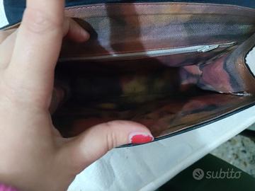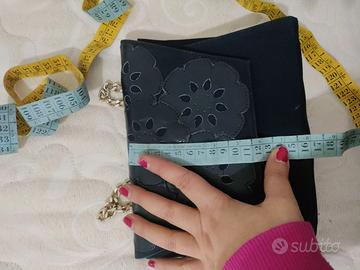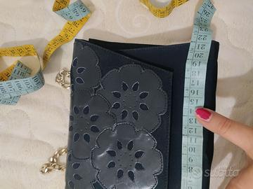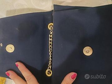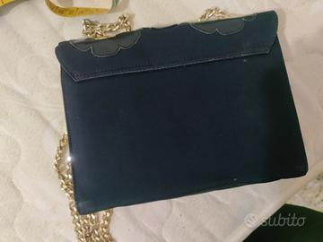 borsa blu corpo di stoffa e patta di similpelle le misure le trovate in foto borsa da cerimonia ma volendo anche per una serata , aprendo la patta presenta una macchia non so se pulendo si possa togliere ma da chiusa non si vede, la tracolla in catena dorata
