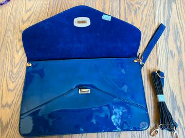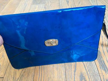 Borsa vernice, color blu, a mano e con tracolla, nuova mai usata, presenza di aloni macchie più scure frontali come da foto, causa inutilizzo.