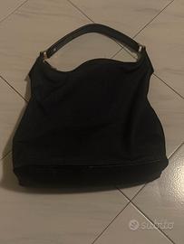 Borsa borbonese secchiello nera in tessuto con manico in pelle. La borsa è in ottime condizioni, alcuni piccoli segni di usura dovuti al materiale sono visibili sulla parte inferiore del manico e sulla base d’appoggio. Tracolla e pochette interna mai utilizzate