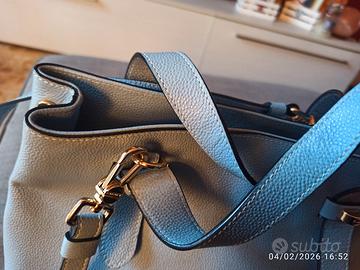 Borsa Borbonese turchese da portare a mano o con la possibilità di tracolla, misura 26 x 12 x 20 cm di altezza. Come nuova da come si può vedere dai dettagli ad eccezione dei Bordini sottostanti, come da foto allegata.