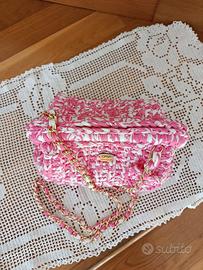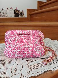 Borsa, borsetta clutch handmade uncinetto in fettuccia poliestere colore rosa e bianco.