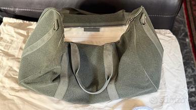 Si tratta di un borsone da viaggio Rolex in tela testurizzata verde con dettagli e finiture in morbida pelle scamosciata. Il modello presenta due manici superiori, una tracolla staccabile con fermagli color argento lucido e un'etichetta portabagagli in pelle coordinata con il logo della corona Rolex in rilievo. L'interno è completamente foderato in tessuto beige chiaro e include una toppa in pelle con il logo Rolex. Spaziosa e versatile, questa borsa unisce praticità e lusso discreto, rendendola ideale sia per i viaggi che per l'esposizione da parte dei collezionisti.