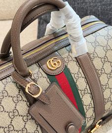 La borsa Gucci Ophidia Boston è realizzata in classica tela GG Supreme beige ebano con fettuccia rossa e verde, che emana un fascino vintage! Le finiture in pelle marrone e la fibbia in metallo con doppia G aggiungono dettagli raffinati. È dotata di una tracolla staccabile, che permette di indossarla a mano o a tracolla, rendendola adatta sia al lavoro che al tempo libero. L'interno ben organizzato contiene facilmente gli oggetti essenziali di tutti i giorni, rendendola pratica, elegante e un classico Gucci preferito!