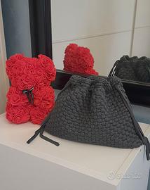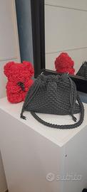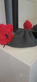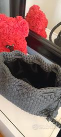 Borsetta modello bottega,realizzata all'uncinetto con fettuccia in lycra,fodera interna in raso e tracolla.