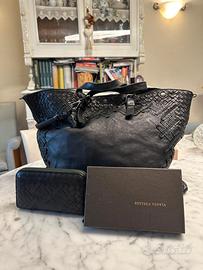 Borsa Bottega Venetapelle nera intrecciata con portafoglio abbinato.