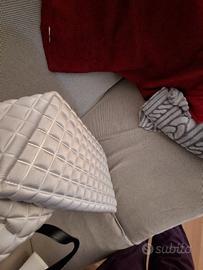 Misura 50 x 35 x 16. Manici in pelle nero, portabile sia a spalla che a mano. Non ha tasca interna. Stupendo colore argento leggermente metallizzato. Bordi perfetti come da foto.