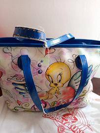borsa con twetty della braccialini. presenza usure, rovinata sui manici e ai bordi e macchiata all'interno.