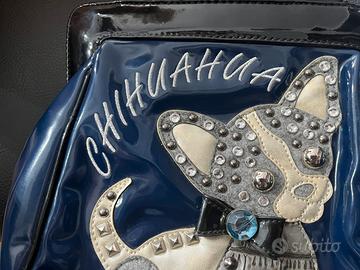 Borsa donna Braccialini, colore blu con manici neri, in vernice, modello chihuahua, linea Tua, lieve piegatura nei manici