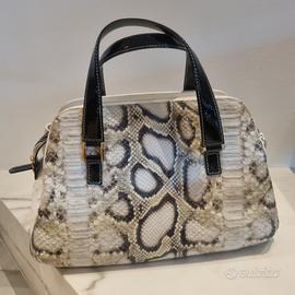 La borsa è realizzata in pelle di vitello con stampa pitone, fianchi di vitello effetto struzzo e rifiniture in vernice contro-colore. Tasca interna. Piedini in acciaio. Misure: h 24x38,5x19 cm.