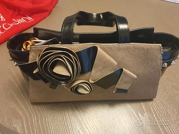 Borsa Braccialini nuova linea Cassiopea in pelle e cavallino. completa di tutto, imballo originale ed etichette ed il suo sacchetto rosso protettivo. Mai usata nemmeno una volta (infatti ha ancora i tagliandi di garanzia originali). all'interno è completamente rivestita con fodera logata, ha una ampia tasca con cerniera e due taschini senza cerniera. a disposizione per eventuali altre fotografie. possibile spedizione con tutto subito o incontro di persona in zona vallecamonica o Brescia.