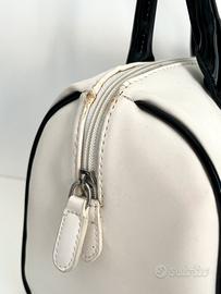 Modello con un design a bauletto in pelle bianca e nera con decorazione frontale in paillettes multicolor, tracolla rimovibile in vernice e due manici superiori. Presenta qualche difetto ai lati della cerniera (visibili in foto)