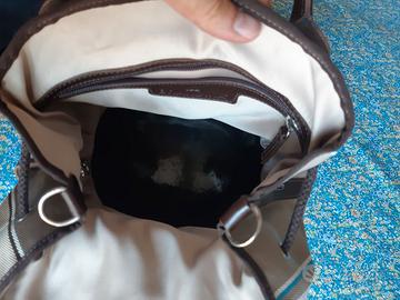 Ha una tasca con cerniera interna e il cordino cerca chiavi col logo.