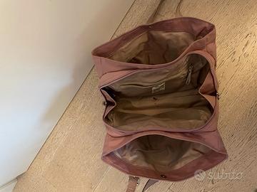 Borsa Brics in tessuto tecnico, colore rosa antico, come nuova, usata solo un paio di volte. Due tasconi laterali, parte principale chiusa con zip, taschina interna chiusa con zip, da portare sia a spalla sia a tracolla. I manici si possono agganciare tra loro e formare una tracolla.