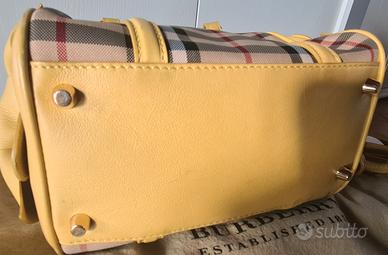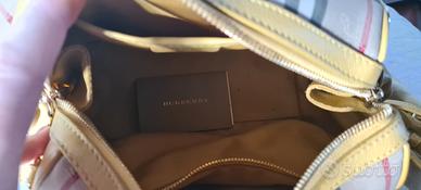Una bellissima borsa a bauletto in tela Burberry con finiture in pelle e tracolla in pelle. Un bel colore giallo. Questa era una borsa in edizione limitata.