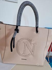 Borsa estiva marca Cafè Noir colore beige con manici intrecciati blu
