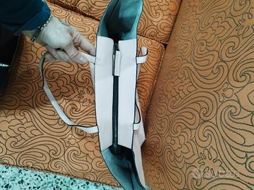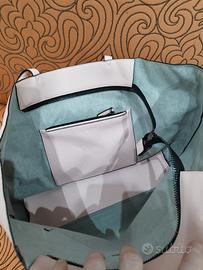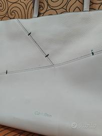 Borsa a mano da donna Calvin Klein della collezione autunno/inverno 2017. Questa borsa shopper da donna di grandi dimensioni di Calvin Klein è realizzata in pelle sintetica. La borsa ha due lunghi manici per un comodo trasporto a spalla e una tracolla regolabile. È decorata con il logo Calvin Klein sul davanti. La tasca principale si chiude con una cerniera. All'interno troverete una tasca aperta e una con cerniera. La borsa può contenere comodamente documenti in formato A4. Mai usata, quindi non usurata, presenta comunque dei difetti di fabbrica, anche se leggeri. Dimensioni: 37x33x15