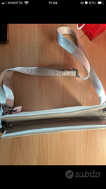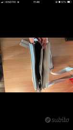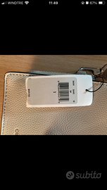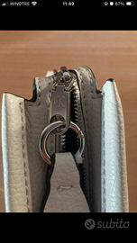Borsa mai usata, con doppio cinturino (da polso e da tracolla). Colore bianco ghiaccio. Ha sul retro un piccolo segno, appena percettibile, come da foto allegata. Tre scompartimenti interni. Prezzo di acquisto 129 $.