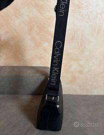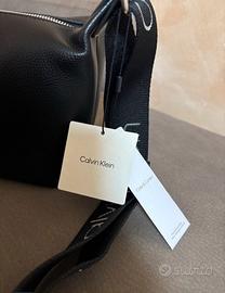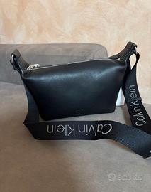 Borsa a tracolla Calvin Klein in pelle nera. Design minimalista con logo inciso. - Tracolla regolabile con logo. - Chiusura con zip. - Tasca interna.
