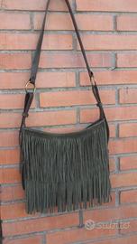 Borsa in camoscio verde con frange davanti e dietro, chiusura zip, tracolla regolabile