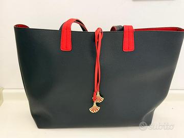 Design raffinato con doppi manici, pendenti dorati smaltati e logo dorato sul davanti.