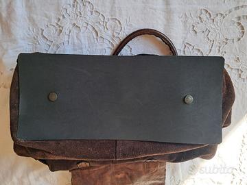 Capiente borsa in cuoio portabile a mano o a spalla. Cuoio trattato regolarmente con prodotto apposito, parti in metallo ( rivetti, fibbie, logo con pesciolino) lucide.
