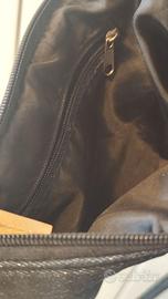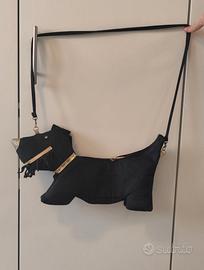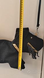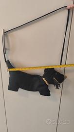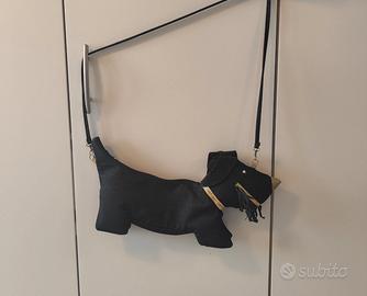 borsa KYOI a forma di cane bassotto - tessuto in nero brillantinato - chiusura a zip lungo la schiena del cane - tracolla sottile (rimovibile) - collare dorato con la scritta KYOI ripetuta in sequenza - frange nere sul musetto - dimensioni: lunghezza 45 cm - altezza 23 cm