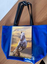 Borsa di vernice blu utilizzata due volte appena. Per rendere l'idea delle dimensione in una foto è stata affiancata da un quaderno di dimensioni classiche