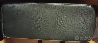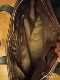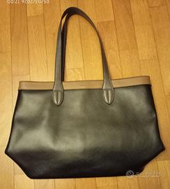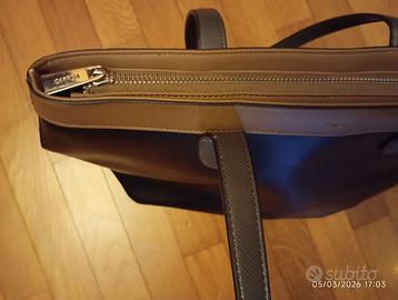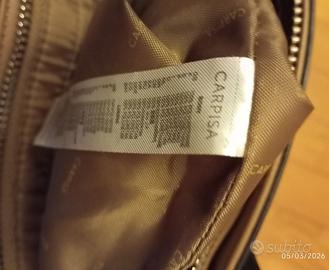 Borsa Carpisa corpo nero con inserti superiori beige e manici color grigio. Si può usare a mano oppure a spalla. L'interno contiene tre tasche: una con cerniera e logo Carpisa; due tasche senza cerniera, affiancate. All'interno, l'etichetta, con marca e indicazioni per la manutenzione. Alla base due leggerissime abrasioni.