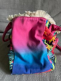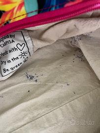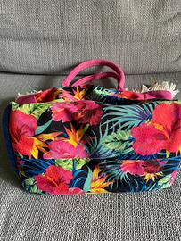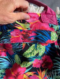 Borsa Carpisa, in tessuto tema hawaii. Ha macchie di inchiostro all’interno come da foto. Misure della base cm 27x18, altezza cm 24 senza manici