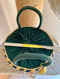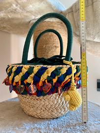 Borsa a cesto in paglia esterna e tela all’interno. Dentro tasca con zip e porta cellulare.