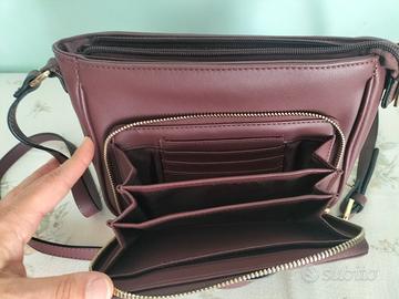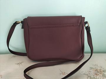 Borsetta a cartella di piccole dimensioni, marca Carpisa, manico regolabile con fibbia. Bordeaux, avorio e nera. Davanti ha una tasca con funzione di portafoglio e portadocumenti. dentro presenta altre tasche con chiusura a cerniera. Chiusura esterna con bottone calamitato. Versatile e pratica, si abbina bene sia ad un abbigliamento casual che a un abbigliamento più formale. Ottime condizioni, praticamente nuova mai usata