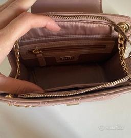 Colore rosa cipria elegante, con trapuntatura, chiusura dorata e tracolla a catena (ancora con protezioni).