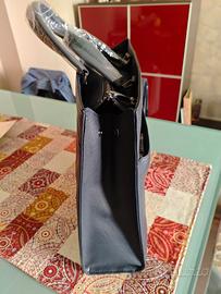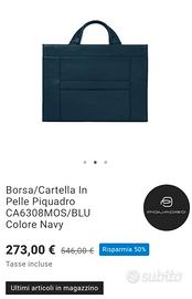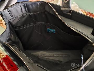 Borsa/cartella in pelle martellata, Piquadro, modello CA6308MOS/BLU, in colore navy, con due manici superiori fissi, con chiusura centrale con cerniera, tasca frontale esterna con chiusura con cerniera, con scomparto interno imbottito per laptop 15,6" e per tablet o iPad 12,9" e sistema di fissaggio trolley con nastro, misure 43,00 x 34,00 x11,00 cm, capacità 15 litri.