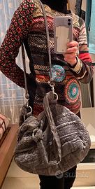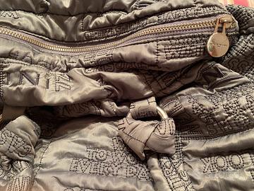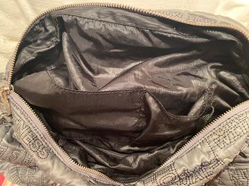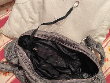 Borsa casual colore grigio particolari in acciaio marca Nannini. Doppia portabilità con asportazione della tracolla. Interno nero con 3 tasche (di cui una chiusa) e gancio per le chiavi