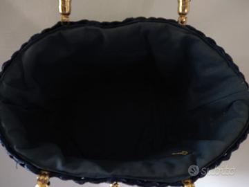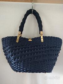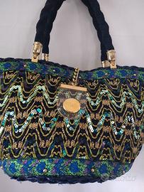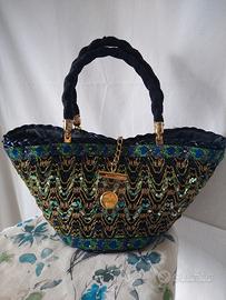 Borsa a cestino in paglia tubolare semirigida Davanti con applicazioni di passamaneria con paillettes blu, verde e oro. Chiusura con gancio magnetico con charms logo del marchio Nelly Molto bella e chic per un tocco di originalità . Foderata in tela blu con taschino interno chiuso da cerniera. Piedini in metallo al fondo, manici rivestiti in canete', metalleria color oro Misure larghezza da cm 24 a cm 42 , altezza cm 23.