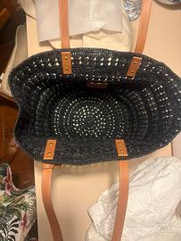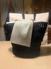 BORSA CESTINO CON MANICI IN PELLE E PORTACHIAVI CON CUSTODIA IN PELLE DECORATO CON ICONICHE INIZIALI YSL.