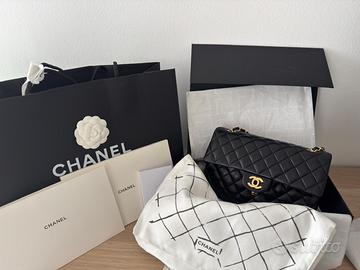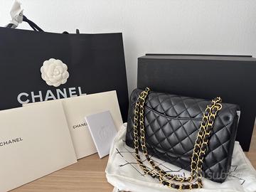 Vendo iconica borsa marca Chanel modello Timeless Classic double flap in pelle di agnello nera con hardware oro, misura 25.5 × 15.5.