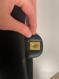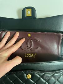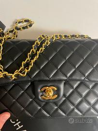 Borsa originale Chanel in pelle nera trapuntata, modello classico con chiusura CC dorata e catena intrecciata oro/pelle. Elegante e intramontabile, perfetta sia per uso quotidiano che per occasioni speciali. Condizioni: ottime, pari al nuovo Colore: nero con finiture dorate Dotazione: scatola originale, dust bag e accessori come da foto