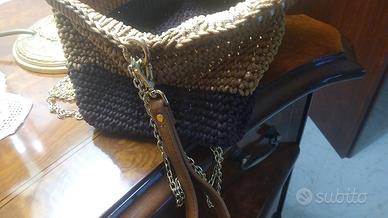 La borsa e' realizzata a mano con cordino.E' dotata di chiusura click clak ed e' munita di catena estraibile.