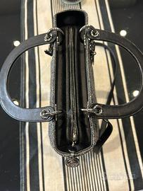 Elegante borsa Christian Dior Lady Dior originale in tessuto grigio/nero con dettagli in pelle nera e charms iconici “D.I.O.R.” in metallo.