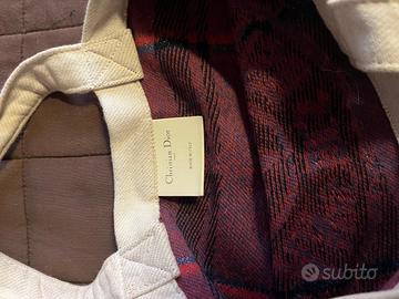 Un pezzo raro e ricercato della Maison Dior. Realizzata in robusta tela color écru con dettagli a righe rosse e blu, questa tote bag esprime lo spirito artigianale e senza tempo della maison francese.